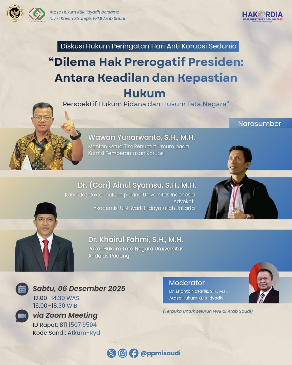 Riyadh, Dalam rangka menyambut peringatan HAKORDIA (hari anti korupsi sedunia) setiap 9 Desember 2025 Atase Hukum sebagai perwakilan kejaksaan pada KBRI Riyadh mengisi dengan diskusi bertema “dilema hak prerogatif Presiden antara keadilan dan kepastian hukum dalam prespektif hukum pidana dan hukum tata negara” pada tanggal 6 Desember 2025.