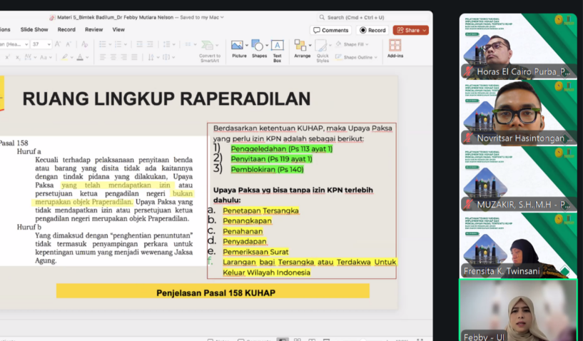 Memasuki hari keempat Pelatihan Teknis Yudisial Implementasi KUHAP dan Pendalaman Pasal Tertentu KUHP yang kembali diselenggarakan secara daring melalui Zoom .