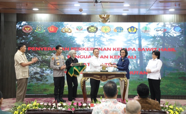 Hasil Penguasaan Kembali Satgas Penertiban Kawasan Hutan(Satgas PKH) secara simbolis diserahkan oleh Jaksa Agung Muda Tindak Pidana Khusus (JAM-Pidsus) Febrie Adriansyah selaku Ketua Satgas PKH kepada Menteri Keuangan dan Menteri BUMN.