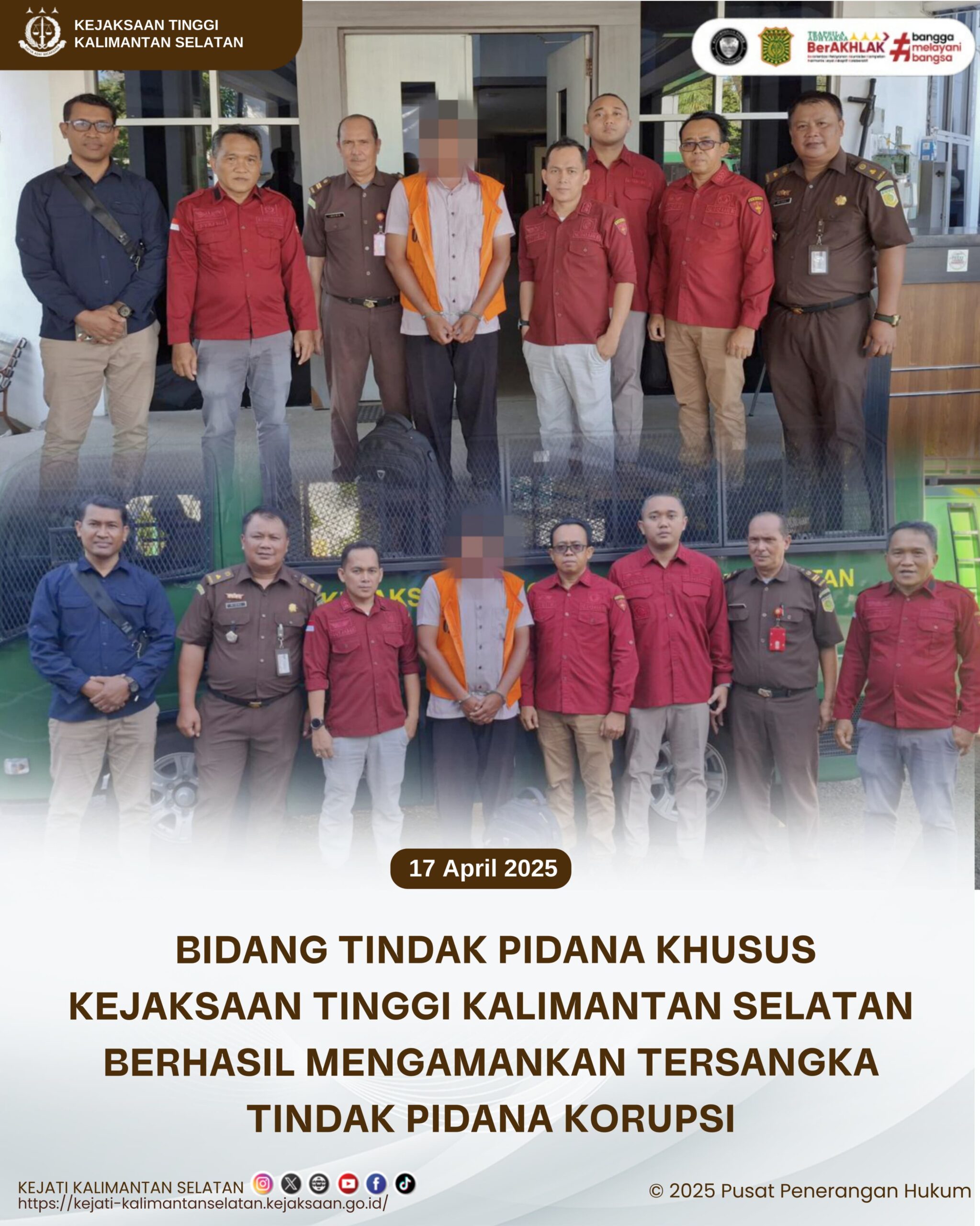 KasI Penkum Kejati Kalsel Yuni Priyono SH MH dalam Pers rilismenerangkan, bahwa Kejaksaan Tinggi Kalimantan Selatan terus berkomitmen untuk menuntaskan perkara korupsi dengan menjunjung tinggi prinsip-prinsip keadilan, transparansi dan akuntabilitas.